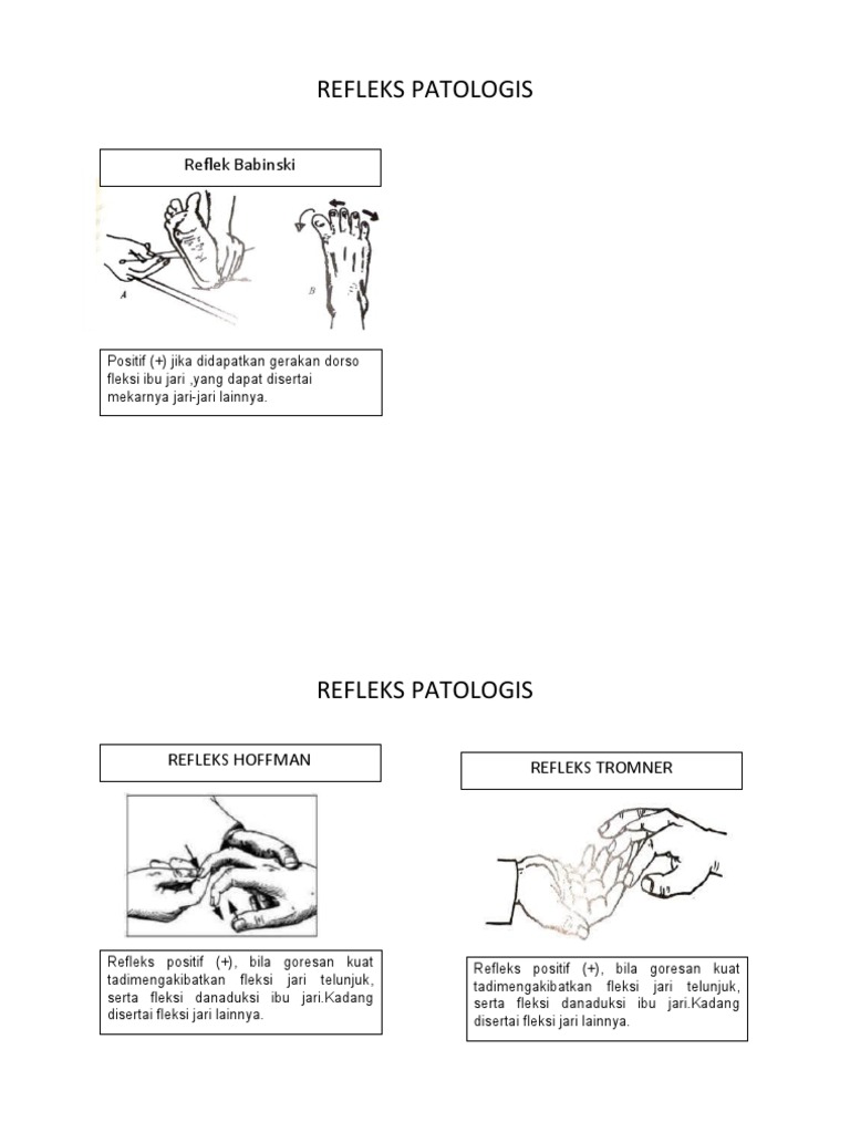 Pemeriksaan Neurologi from reader017.dokumen.tips Normalement, chacune des 5 premières percussions induit un clignement, puis le réflexe diminue. Normally, each of the first 5 taps induces a single blink, then the reflex fatigues. Le réflexe nasopalpébral signe de la glabelle , est un clignement rapide en réponse à la percussion de la racine du nez; Para evaluar el signo de la glabela , hay que golpear suavemente la frente con el fin de provocar un parpadeo; For the glabellar sign , the forehead is tapped to induce blinking; Tromner sign is similar to the hoffman sign, but the finger is flicked upward. En general, cada uno de los 5 primeros golpes induce un único parpadeo, luego el reflejo se fatiga. El signo tromner es similar al de hoffman, pero el dedo se mueve hacia arriba.